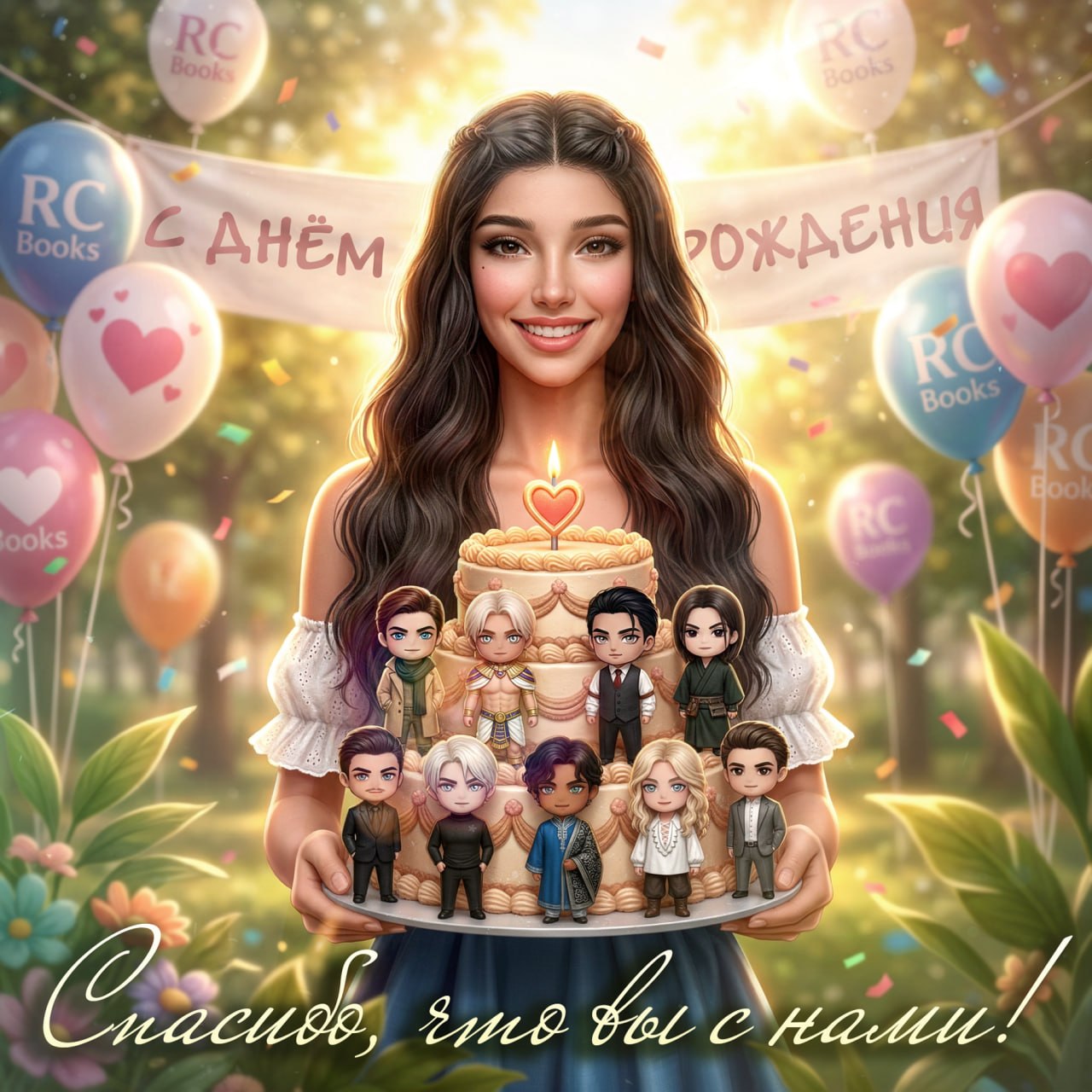 Посмотрите на этот праздничный торт в руках Лайи: на нем собрались те, кто стал нам по-настоящему близок. Мудрый Кадзу, величественный Амен, харизматичный Александр, загадочный Влад и другие… Каждый из них живёт в наших книгах благодаря вашей любви и поддержке.
