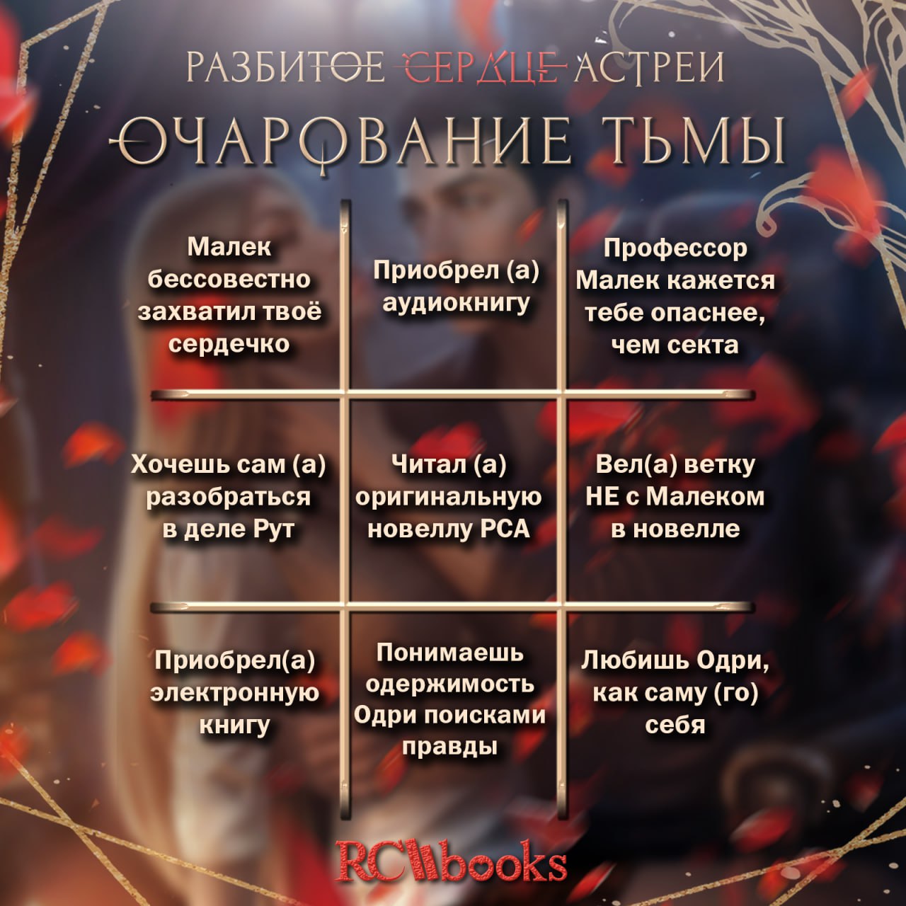 Сегодня прекрасный день для игры в бинго по нашей новинке «Разбитое Сердце Астреи: Очарование Тьмы»! Если ещё не начали читать, Малек предлагает вам хорошенько подумать и выбрать один из двух форматов — электронную или аудиокнигу.😎