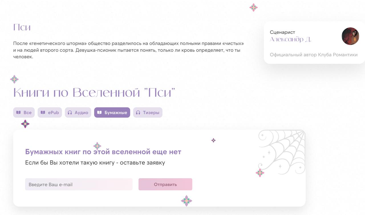 🔥 У нового раздела есть одна интересная возможность! На странице каждой из вселенных новеллы КР, вы увидите в виде активных кнопок все варианты произведений, доступных на сайте по выбранной вами истории, в том числе будет и кнопка «Бумажные». Если бумажных книг от RC Books по вселенной этой новеллы ещё нет, вы можете оставить заявку на её появление! Просто введите адрес своей электронной почты и отправьте ваше пожелание нам!